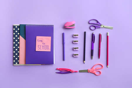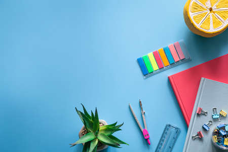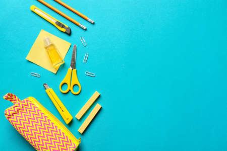 school stationery on color background