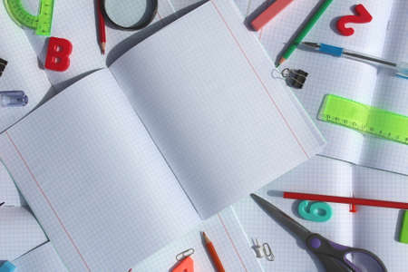 Blank open notebook with blank sheets and around stationery and colour pencils ruler. Space for text, office work during quarantine and virus