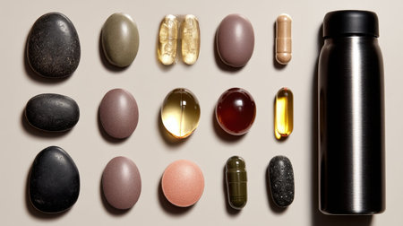 A visually appealing arrangement featuring various stones and vitamin supplements alongside a sleek water bottle, showcasing wellness concepts and healthy lifestyle choices.