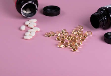 Pile of capsules Omega 3 on pink background. Close up, top view, high resolution product.