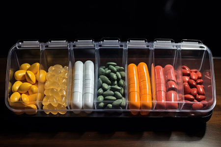 Plastic containers for storage and everyday use of tablets, pill boxes with colorful pills