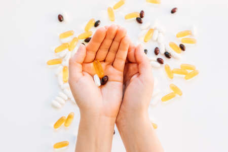Pouring pills and capsules on a white background close-up. Top view with copy space. Medicine concept