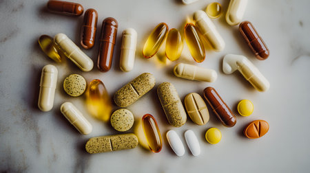 Collection of different colors and sizes of vitamins and supplements taken with breakfast for healthy lifestyle