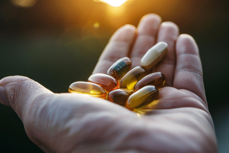 handful of pills in hand, yellow capsules, pills boosting immunity