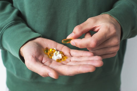 Close-up of hands holding various pills and capsules, illustrating the concept of health, supplements, or medication use, with a green sweater in the background