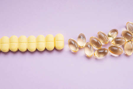 Vitamin tablets and pills on a violet periwinkle background. dietary supplements and pills for dieting. medical concept. Complementary and medical products