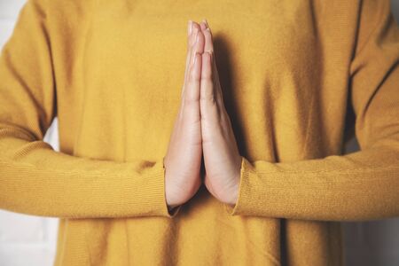 Woman with hand in praying position,Female prayer hands clasped together