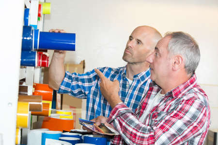 Caucasian male customer looking to buy tools or paint and asking a question to the hardware store worker