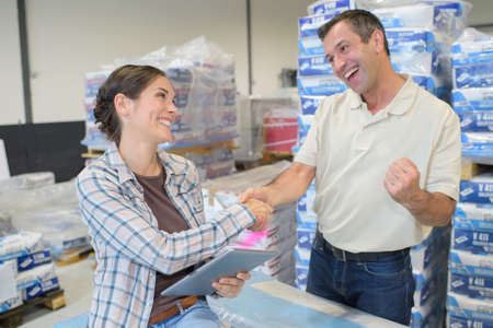 female worker shake hand with male worker in warehouse