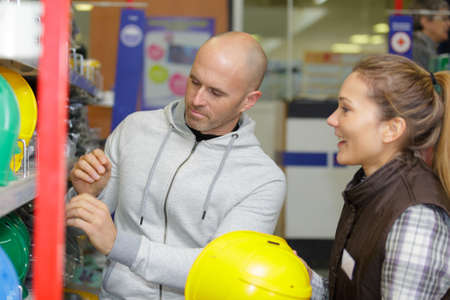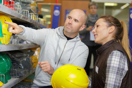 workers choosing construction helmets in hardware store