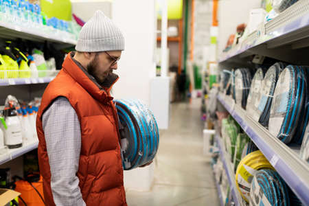 a customer in a garden supply store chooses a rubber watering hose