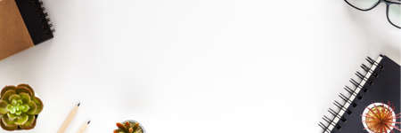 White office copy space. Home office. Office supplies, plants, notebook. View from above. Panorama