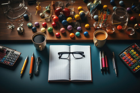 Overhead shot of a desk with various office tools, and calculator. creative photo.