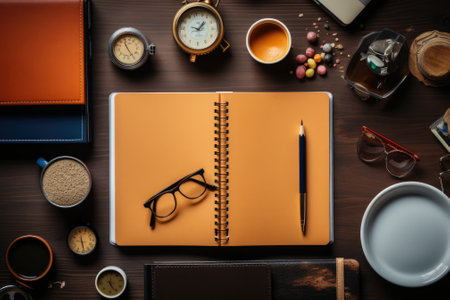 The view from the top office supplys items open notepad, pens and pencils.