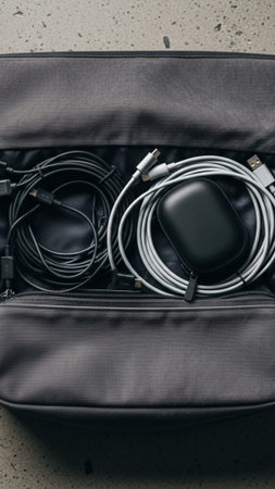 Discover a vibrant collection of charging cables and USB connectors arranged neatly on a wooden surface, perfect for tech enthusiasts and creative projects.
