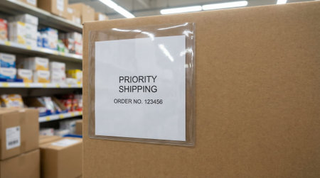 Close-up view of a shipping label on a box in a warehouse environment
