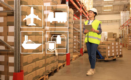 Illustration of shipping icons and woman with tablet working at warehouse. logistics center