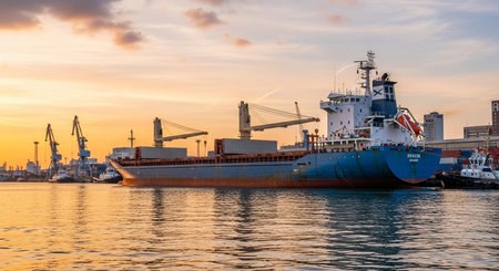 A striking image of a large container ship docked in a busy harbor, surrounded by towering cranes against a moody sky, illustrating the critical operations of maritime logistics.