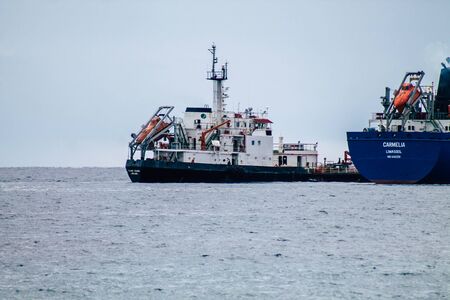 Limassol Cyprus March 20, 2020 View of a ship off the Cypriot coast facing the city of Limassol in the afternoon