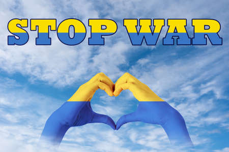 Hands painted in the colors of the flag of Ukraine depict the shape of a heart against the sky with clouds and the sun and the text STOP WAR. Support of the people of Ukraine. Peace concept