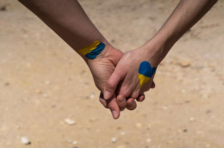 Love Ukraine concept. Hands in the shape of a heart are painted in the color of the flag of Ukraine - yellow and blue. selective focus. Independence Day of Ukraine, flag