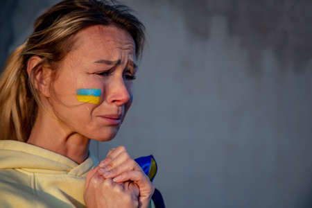 Pray for Ukraine. Close up of Ukrainian blue and yellow flag during war. Invasion in Ukraine. Russian occupation