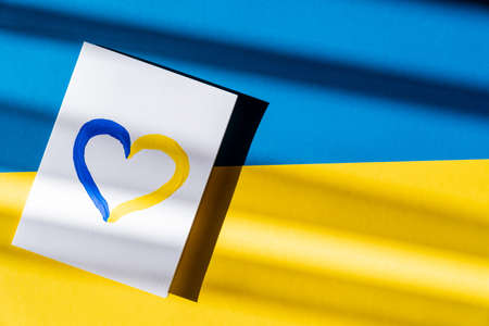 Top view of painted yellow and blue heart sign on card on ukrainian flag