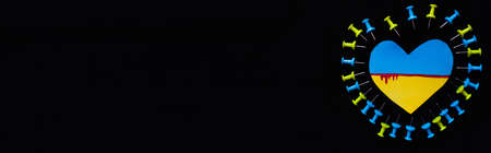 Top view of push pins and ukrainian flag with blood in heart shape isolated on black, banner