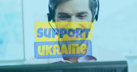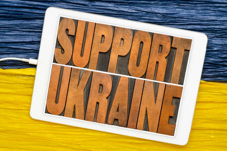 support Ukraine - motivational words in vintage letterpress wood type on a digital tablet against blue and yellow paper background in colors of Ukrainian national flag