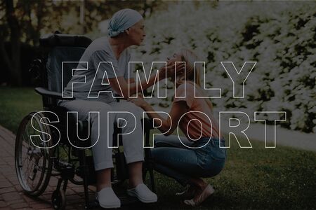 Collage Woman in Wheelchair and Daughter on Walk. Mature Sick Woman Hugging Young Beautiful Girl Outdoors. Patient with Cancer. Enjoying Fresh Air. Togetherness, Love and Family Support Concept