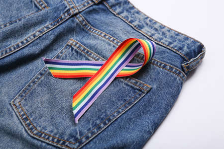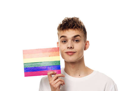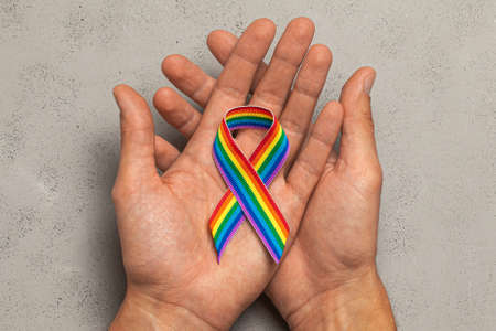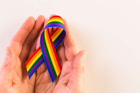 LGBT tape in hand. Pride rainbow ribbon in the hands of a man.