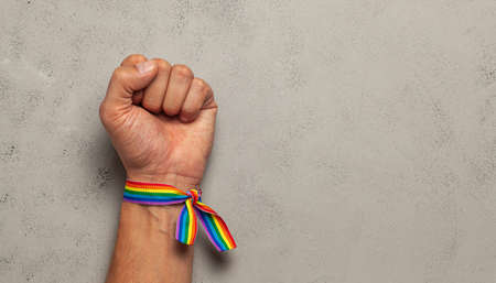 Black arm wearing a bracelet with the colors of the LGBT flag closing the fist as a symbol of strength and struggle. LGBT symbol.