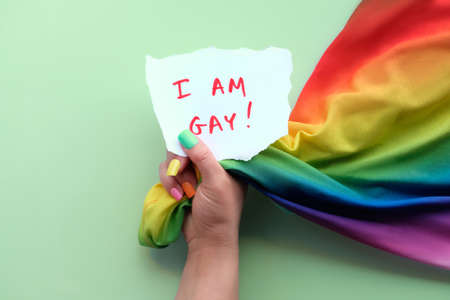 Text I am Gay on paper in hand with fake nails in colors of rainbow. Hand holds rainbow flat. Flat lay, top view on mint green paper. Concept shot for LGBTQIA pride month.