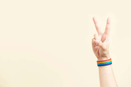Young hand making the victory or peace sign, wearing a rainbow bracelet, LGBT symbol. Concepts of struggle, strength and pride of gays, lesbians, bisexuals and transgenders. Image with copy space.