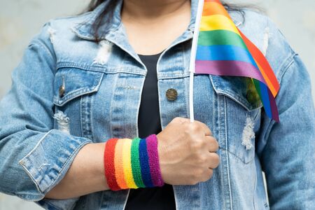 Asian lady wearing rainbow flag wristbands, symbol of LGBT pride month celebrate annual in June social of gay, lesbian, bisexual, transgender, human rights.