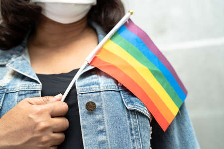 Asian lady holding rainbow color flag, symbol of LGBT pride month celebrate annual in June social of gay, lesbian, bisexual, transgender, human rights.