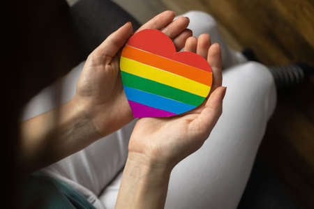 Female arms holding the heart coloured in LGBT pride colours on the dark background. Concept of the International Day Against Homophobia concept, sexual equality, feminism, social safety and protection
