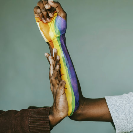 A raised fist wrapped in a rainbow bracelet, symbolizing LGBTQ+ pride and solidarity, set against a vibrant, colorful background.