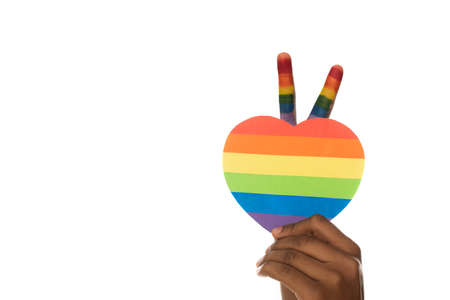 cropped view of african american man showing victory gesture and lgbt colors paper heart isolated on white
