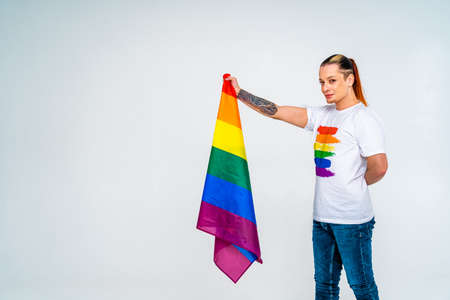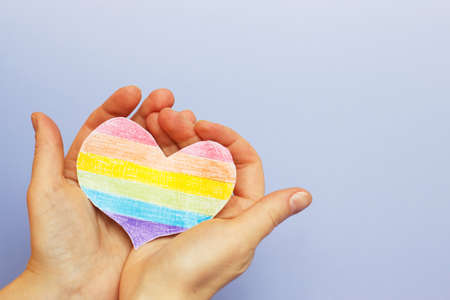 LGBT community background with copy space. Girl hand with heart shaped LGBT rainbow flag and symbol photo