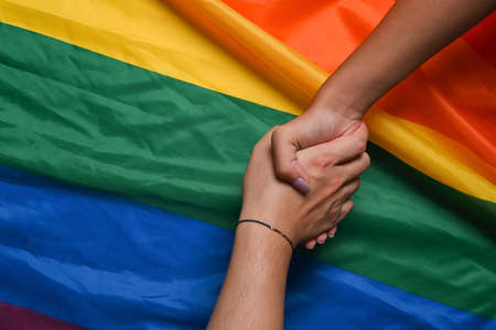 Gay Couple Holding Hands. LGBTQ Flag. LGBT Life