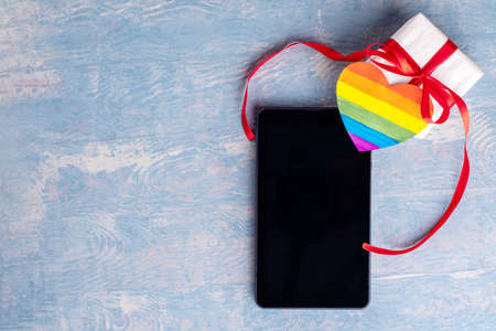 Online shopping for Valentines Day LGBT concept. Online congratulations concept. Gift box with red ribbon, tablet or smartphone and painted paper LGBT heart shape on blue background, copy space