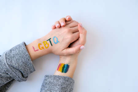 Rainbow LGBTQ flag painted on hand. Support for lgbt community. Honor of pride month. Connecting people, touching hands. Multi colored hands art creativity, discrimination.
