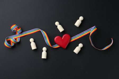 Tolerance concept. Human figures, heart and colorful ribbon on black background, flat lay
