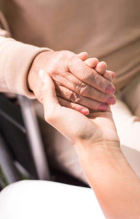 Elderly woman holding hands as a symbol of support and assistance in the hospice with euthanasia