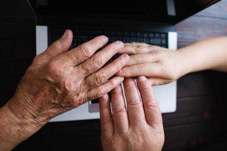 An older hand meets a younger hand in a tender gesture highlighting family bonds and care.