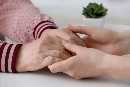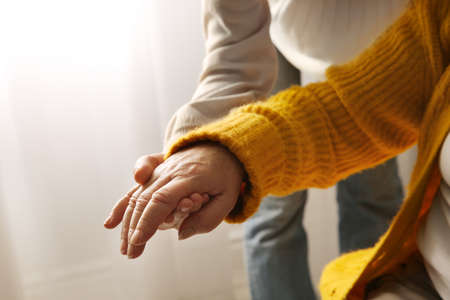 Close up granddaughter takes care of the health sick grandmother at home by holding hands. Lifestyle support the love of the family.