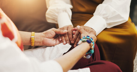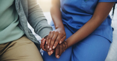 Patient, hands and nurse with care for empathy, trust or listening with understanding of pain, grief or crisis at home. Closeup of caregiver or therapist touching palm for support, love or sympathy