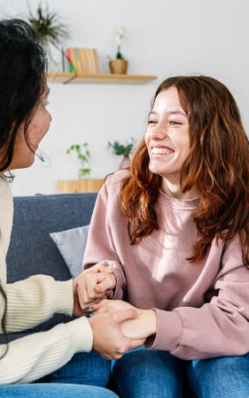 Holding hands, trust and women friends on sofa with comfort, love and bonding together. Support, compassion and female people with connection in living room for empathy, care or solidarity in home.