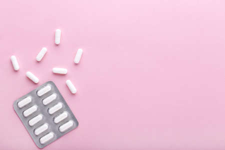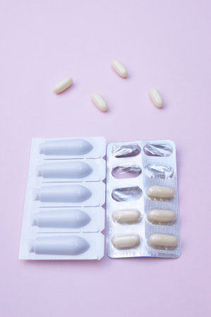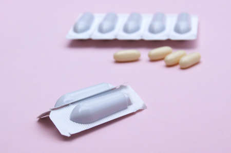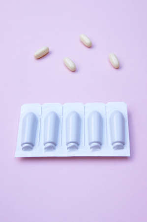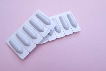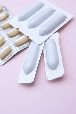 Gynecological medicines for womens health in form of suppository, capsules on pink background.